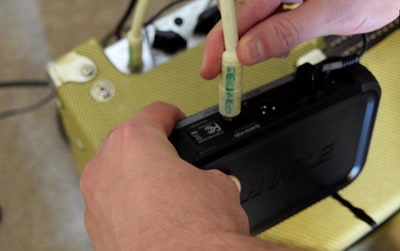 2. Power the receiver and plug an instrument cable from the amp to receiver.